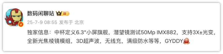 7月9日,知名博主数码闲聊站独家爆料:“中杯定义6.3英寸小屏旗舰,潜望镜测试5000万像素IMX882,支持3倍光学变焦,全新光焦棱镜模组,3D超声波,无线充,满级防水等等,该有的都有!”没错,不仅标准旗舰直接调整为6.3英寸纯直屏,甚至还用上了光焦棱镜模组。评论区说得好:“标准版硬生生整出了Pro mini的味儿,全系直接升杯!”